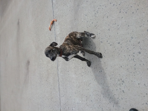 Lurcher, aged around 6 months, dark brindle & white, short hair, will be med-large
