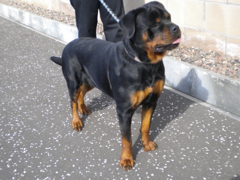 Rottweiler, female, aged around 2-3 years, black & tan, short hair, large.